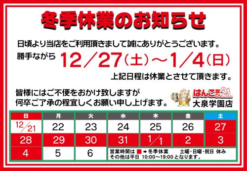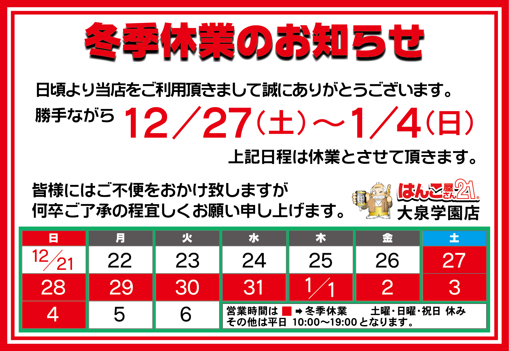 2025 年 12 月 24 日 – PM 5:23 2025-26年年末年始休業のご案内 はんこ屋さん21大泉学園店です。 誠に勝手ながら、 12/27(土)~1/4(日)の間、休業とさせていただきます。 皆様にはご不便をおかけしますが、何卒よろしくお願いいたします。 ※関係業者の休みにより納期が通常より遅れる 場合がございますので、ご了承ください。 本年もお世話になりました。 来年も何卒よろしくお願い申し上げます。